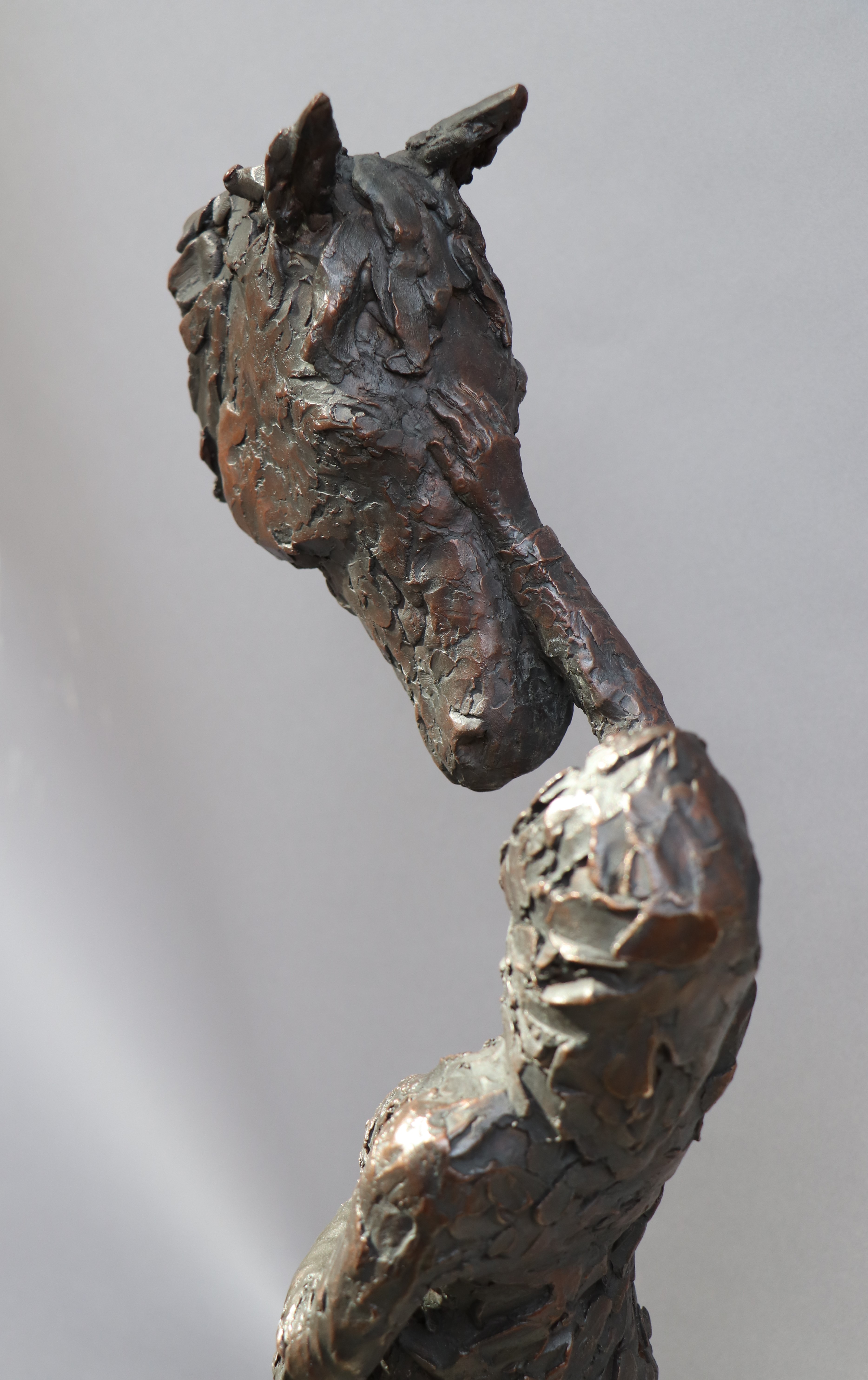 A small maquette of H.M. Queen Elizabeth II with one of her beloved horses. Patinated in a traditional penny bronze.
